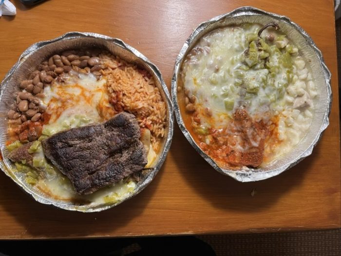 右側がニューメキシコの有名なChiles Rellenos(チリ・レジェノス)です。大きめの緑色のチリにチーズやひき肉を詰めてあります。