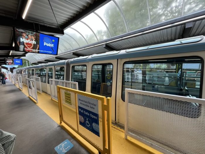 高架から街並みを見下ろせるので、景色を楽しみながらのちょっとした観光体験にもなります。ポップカルチャー博物館の建物の間を通っています。小さな子供連れでも安全で、短い距離なので飽きずに乗れるのも魅力です。